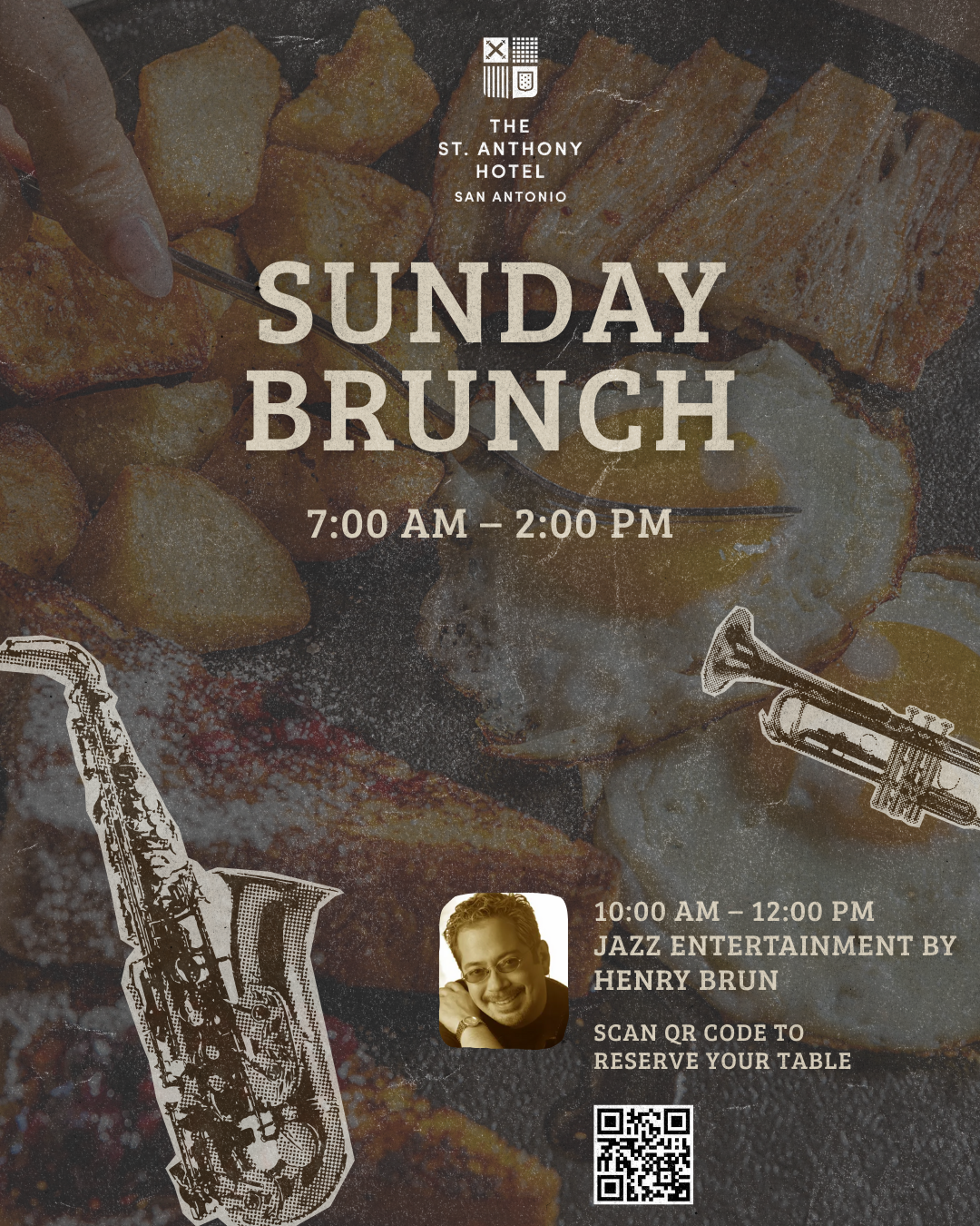 Timeless elegance meets soulful sound at The St. Anthony Hotel Sunday Jazz Brunch. Dine beneath crystal chandeliers as you enjoy a decadent brunch menu paired with live jazz by the renowned Henry Brun.