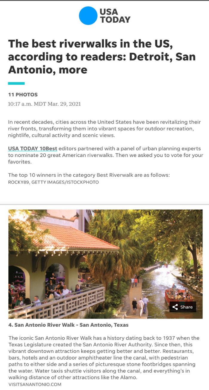 USA Today – The best riverwalks in the US, according to readers: Detroit, San Antonio, more
